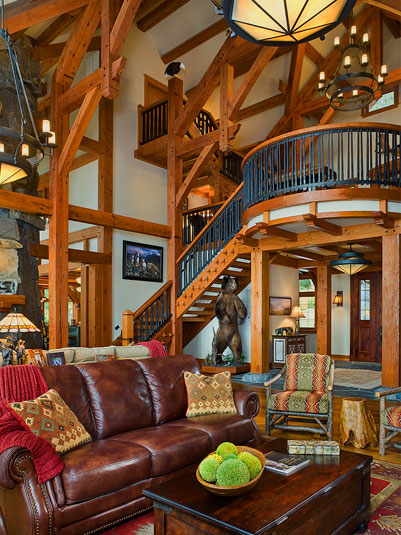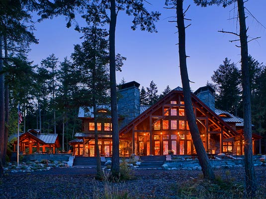 The Island Lodge was modeled after the rustic national park lodges of the 1930s. Constructed with heavy timber beams recovered from a turn-of-the-century warehouse, the project utilizes sustainable, recycled materials. The timber frame employs hammer beams connected with mortise and tendon joints secured by oak pegs. This joinery allows the wood frame to span across the entire great room. Two massive chimneys serve to anchor the space and support the structure, as well as providing flues for the lodge's seven fireplaces. In addition, radiant floor heating supplements the fireplaces to warm the lodge. Gently curving across the front, the window wall passes elegantly between the interior and exterior timber elements.